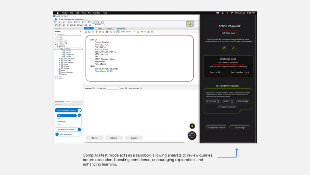 Initially, we envisioned ComplAI as a system-level integration designed to seamlessly integrate with the settings of an analyst’s work desktop. Functioning from the control center, it leverages the system’s capabilities to provide real-time compliance support. ComplAI can detect potential compliance risks, alert users to issues, and recommend actionable solutions, all while operating discreetly in the background to enhance efficiency without disrupting the analyst’s workflow.