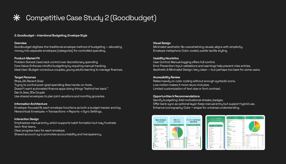 This page presents a comparative study of four leading financial apps—YNAB (You Need A Budget), Acorns, Goodbudget, and Greenlight—each chosen for their unique approaches to budgeting, saving, and financial literacy. These UX case studies helped uncover best practices in habit formation, data visualization, and user engagement, while also revealing critical gaps in personalization, cultural relevance, and educational support—especially for international students navigating complex financial ecosystems.
