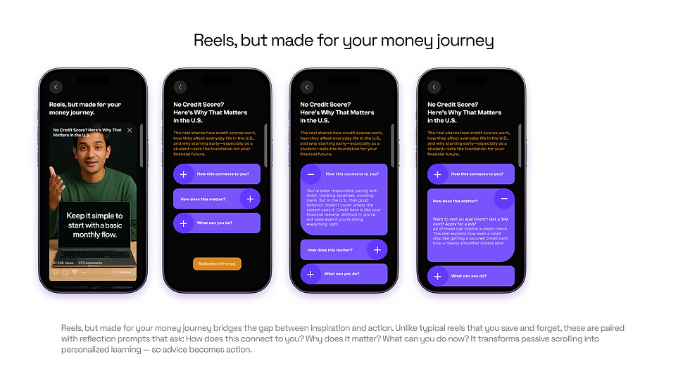 Working on Finmates taught me that financial literacy isn’t just about numbers—it’s deeply emotional, cultural, and often overwhelming, especially for international students navigating a new system. I learned how important it is to meet users where they are, not just with information, but with empathy and timing. Designing with evolving needs in mind—rather than assuming a fixed user state—helped me think more adaptively, and pushed me to build a product that could grow with its users, not just teach them.