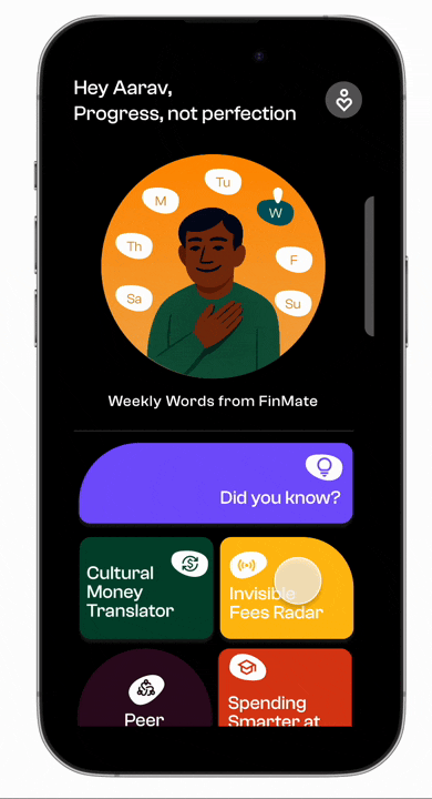 Aarav, a graduate student from India, arrives in the U.S. excited but quickly finds himself overwhelmed by unfamiliar banking systems, hidden fees, and pressure to manage everything on his own. His budgeting apps feel disconnected from his reality, and advice online is often confusing or irrelevant. That’s when he turns to Finmates — a financial companion that helps him set personal goals, sends culturally aware reminders, and breaks down financial concepts into digestible, timely prompts. Over time, Aarav builds confidence, starts saving intentionally, and begins seeing money as something he can control not just survive.
